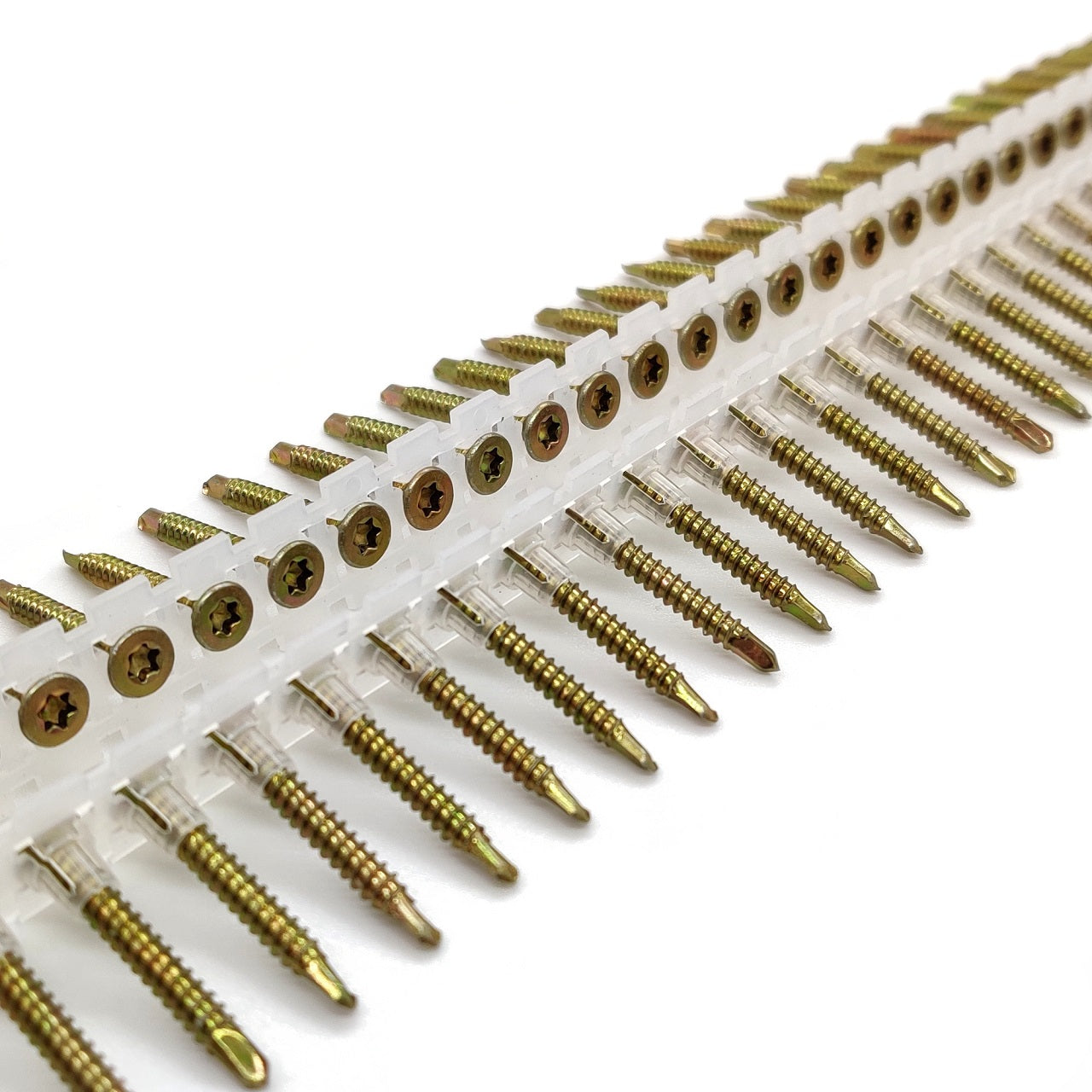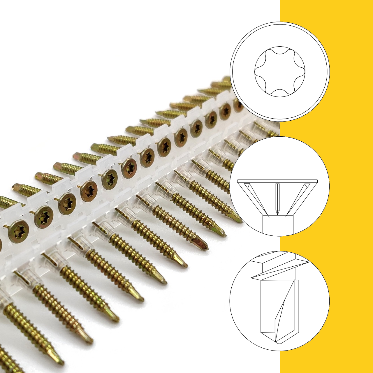 Mit diesen magazinierten OSB Ständerwerkschrauben verschraubst du OSB Platten super schnell und einfach auf deinem Metallständer. Die praktische Bohrspitze macht lästiges Vorbohren der Unterkonstruktion überflüssig, da sie leicht und sicher den Metallständer durchdringt.