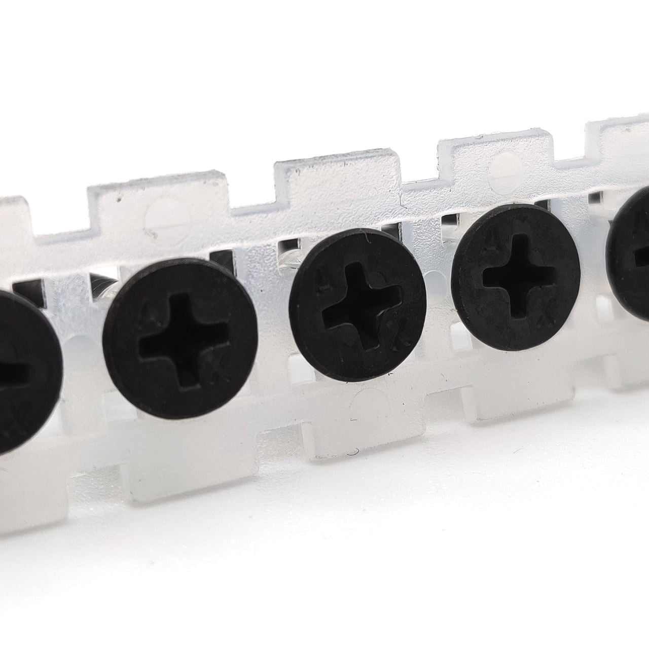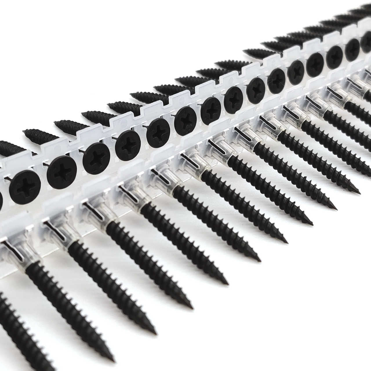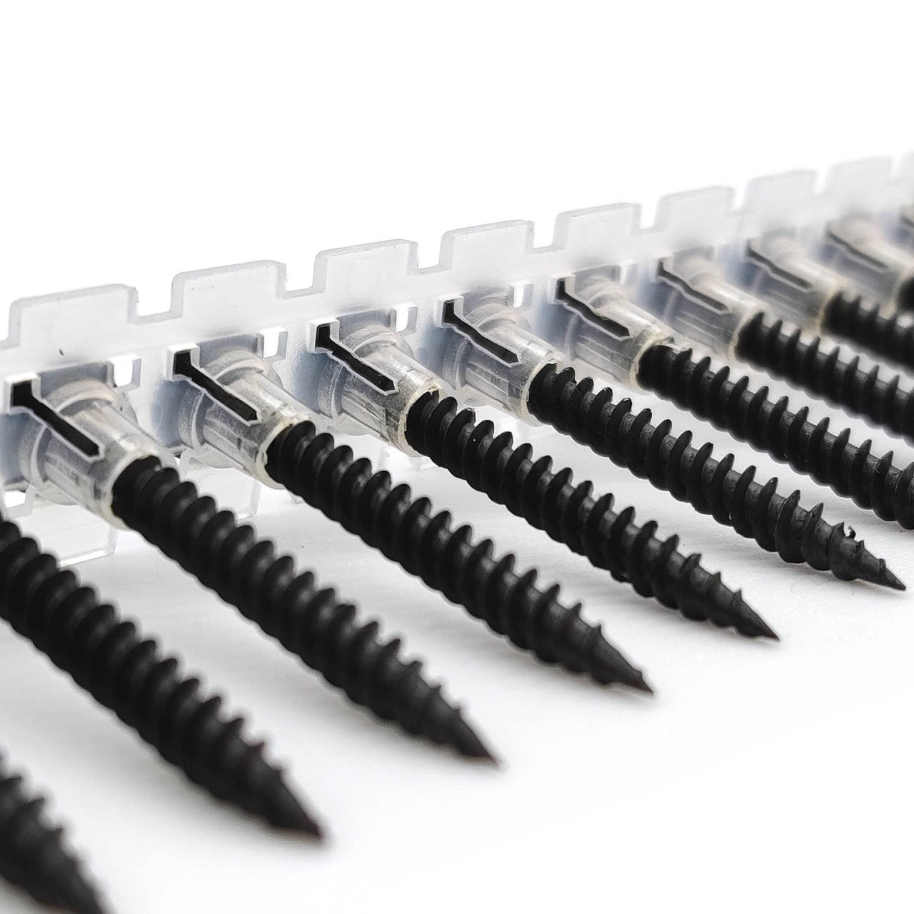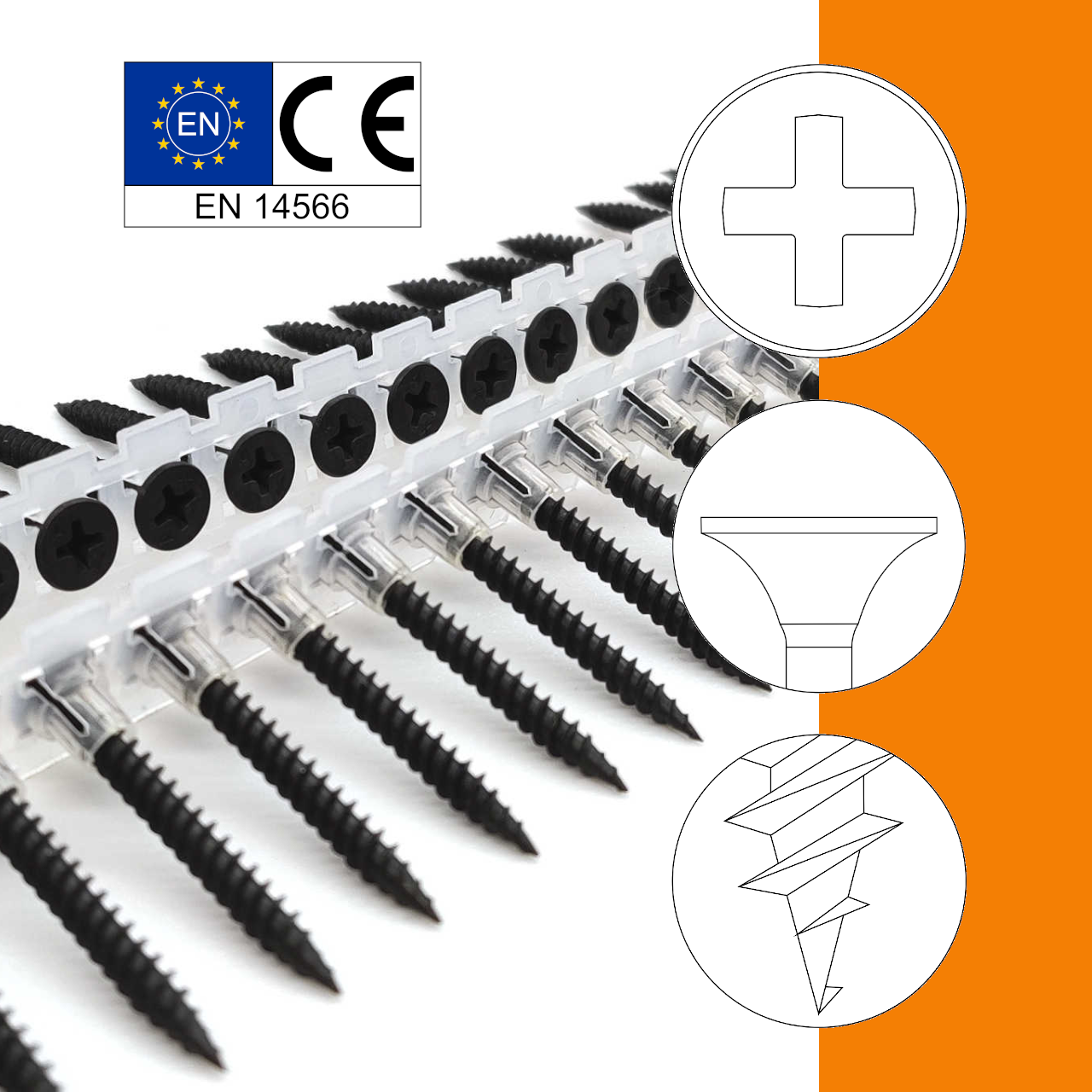 Magazinierte Schnellbauschrauben mit Feingewinde bestehen aus phosphatiertem Kohlenstoffstahl C1022. Diese Phosphatierung schützt sowohl die Schraube, als auch die Gipsplatte vor einer chemischen Reaktion. Durch das anschließende Verspachteln der Einschraubstellen wird die Schraube vor Feuchtigkeit geschützt und verhindert so Rostschäden.